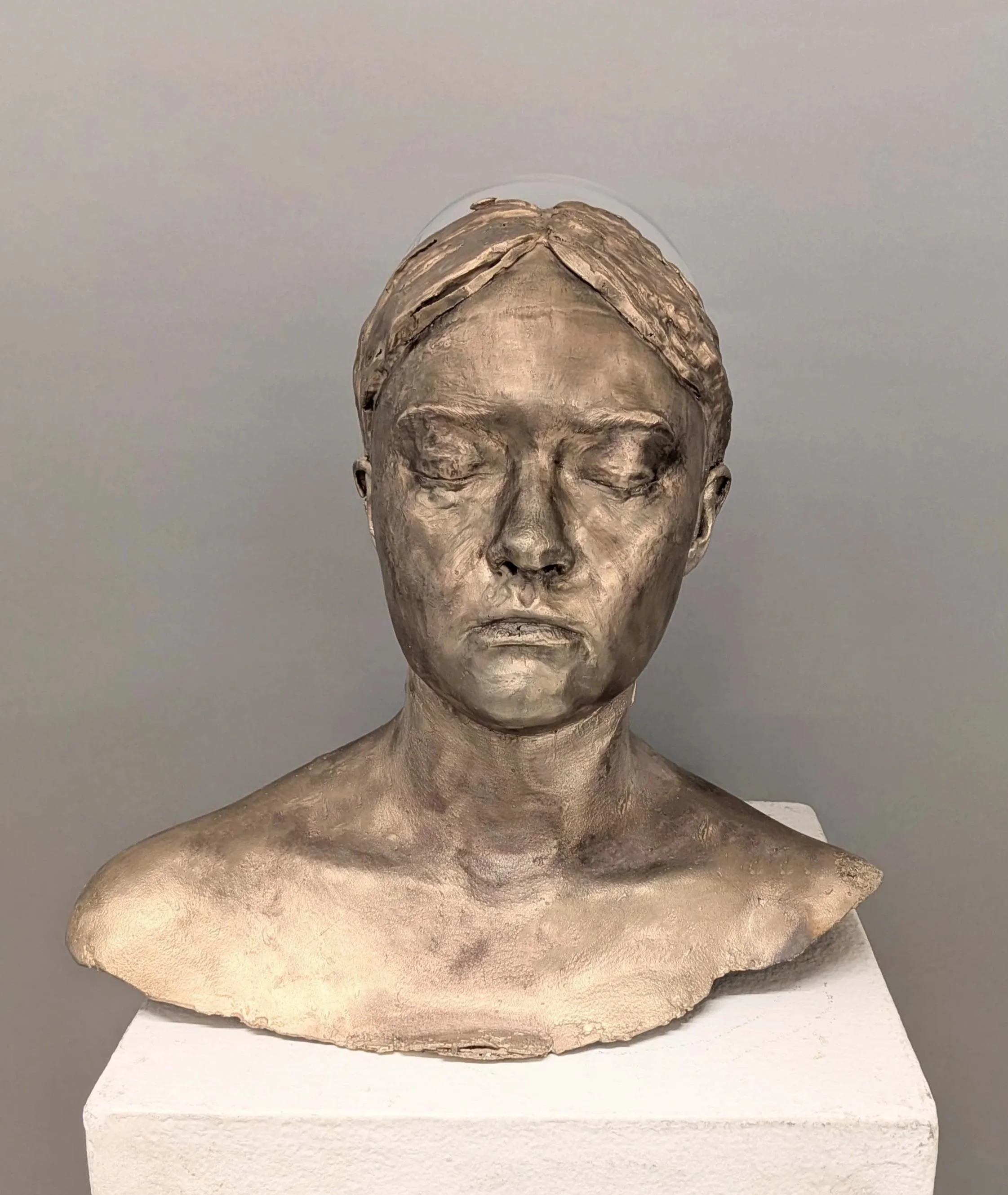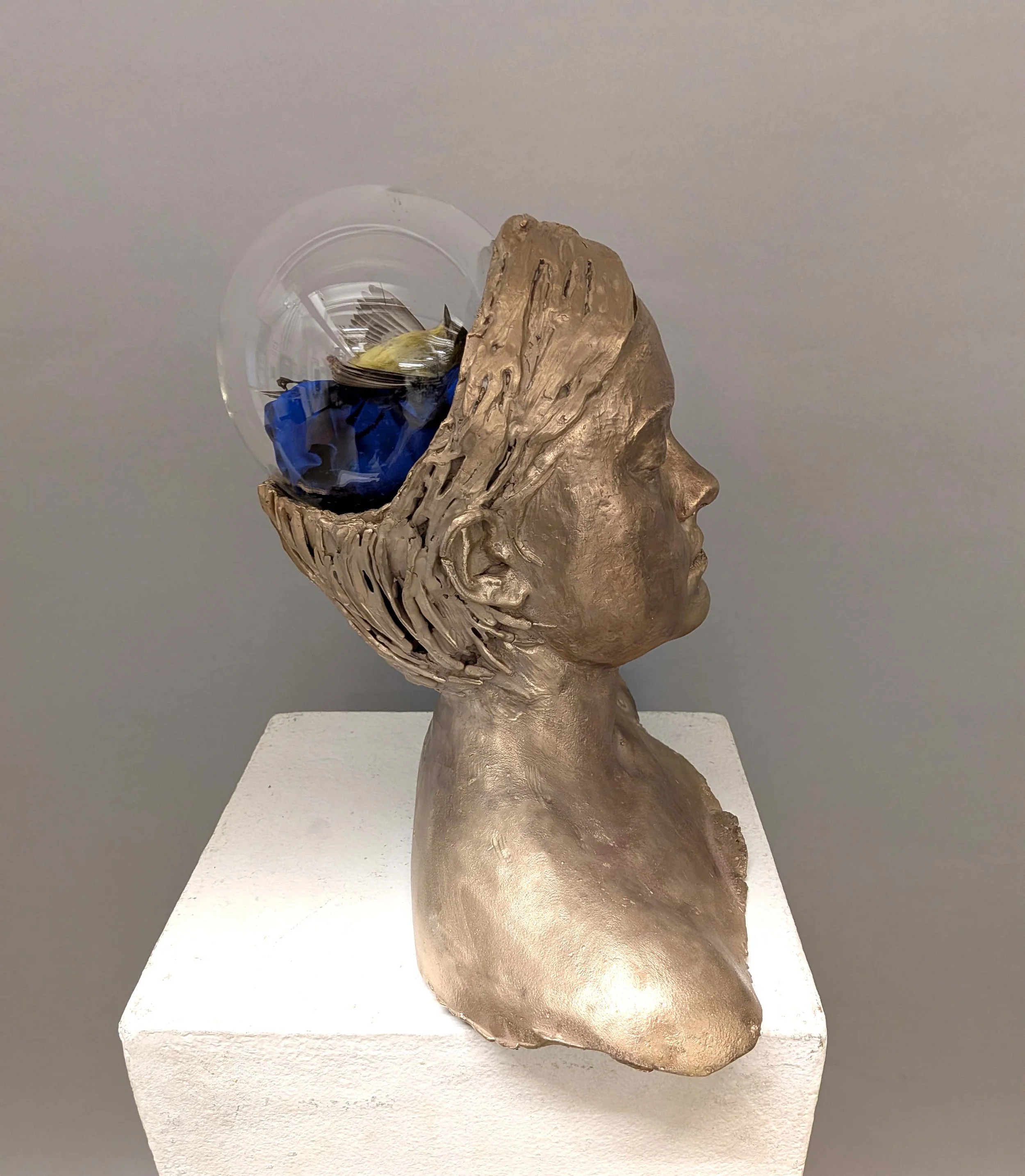 mixed media sculpture, bronze bust with mummified bird encased in glass globe, 2025.